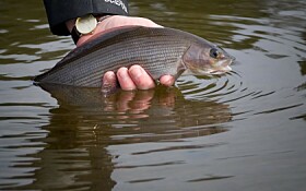 In its lower sections, the river has carved deeply into glacial deposits and bedrock, and several stretches run through a narrow and dramatic V-shaped valley. These areas are classic grayling waters with plenty of fine fish. The fish population is dominated by trout and grayling, but bullhead, burbot, and minnows are also found throughout the river system.