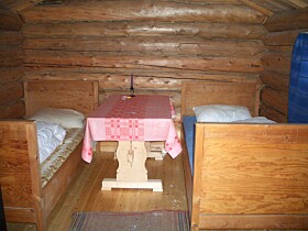 Next to the cabin you will find “Calcutta”, a small log cabin with two beds and a fireplace. In addition to this we have a similar cabin in the forest also with room for two people.