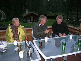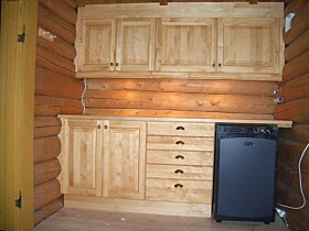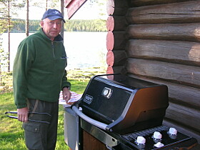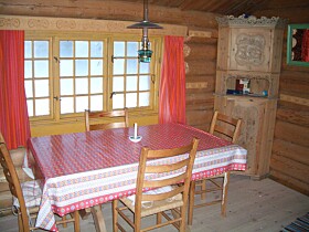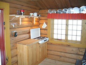 Accommodation are in rough log cabins with self catering. There are bads for 6 people in total the cabin. You will also find a boathouse, outhouse and woodshed. The cabin has a porch with furniture for 6 people. The kitchen have a cooking stove (propane), a cooler (propane) and everything you need for cooking and serving. It has a 12 v solar panel for lights and charging. In the living room there are table for 6 people and a sofa in front of the fireplace.